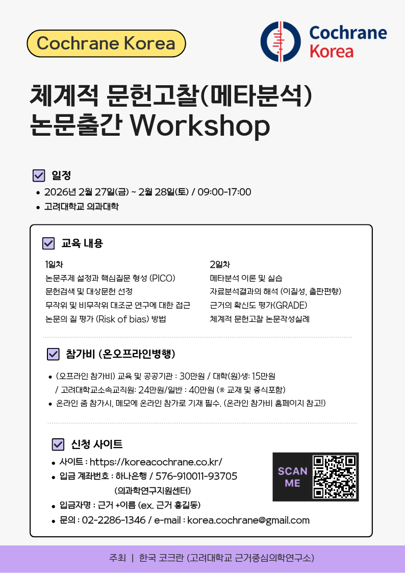 저희 한국 코크란에서 2월에 체계적 문헌고찰 워크숍을 개최합니다.